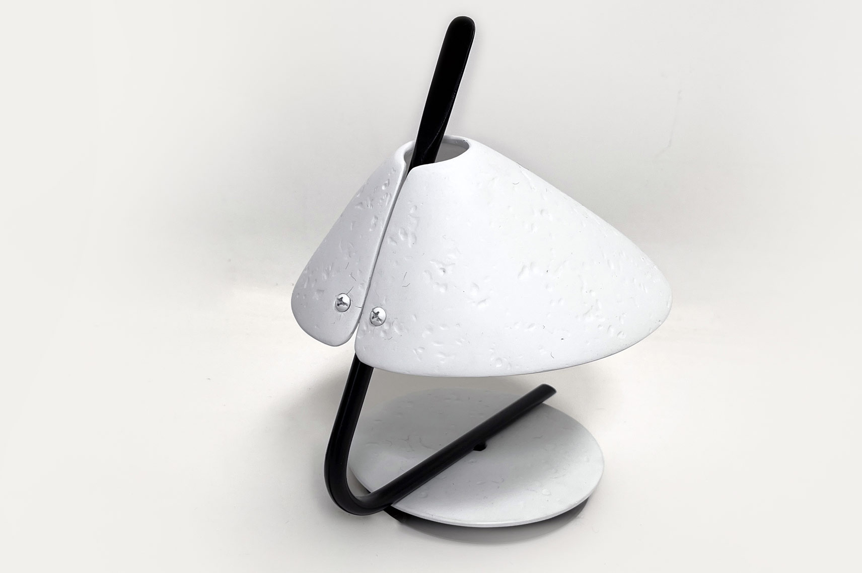 This lamp was scaled to work perfectly as a desk lamp, bedside lamps, or end tables. With its matte black finish on the metal base and shade, a soft indirect is diffused. Model Shown Custom Size Available Dimensions: H. 17” x Dia. 10”