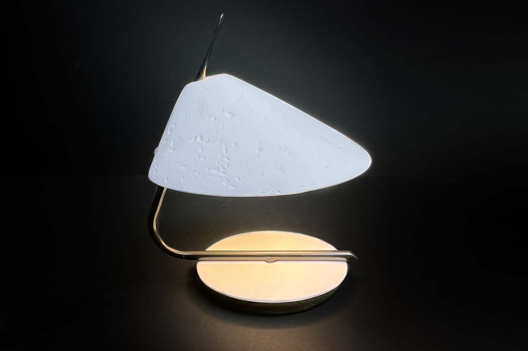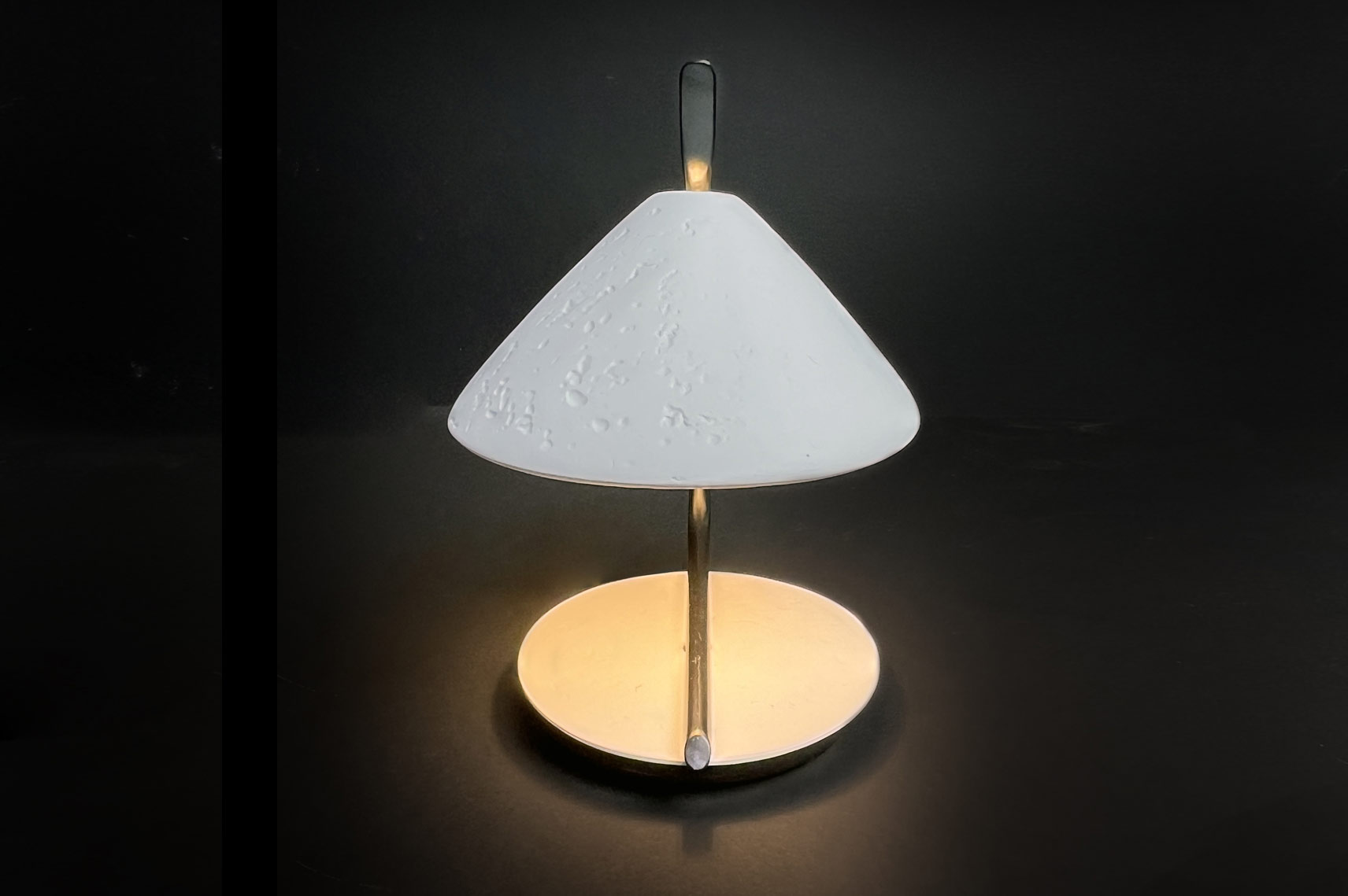 This lamp was scaled to work perfectly on side tables,  bedside tables or on a desk. The brass shade and base reflects a warm golden light. Model Shown Custom Size Available Dimensions: H. 18” x W. 16” x D. 9”