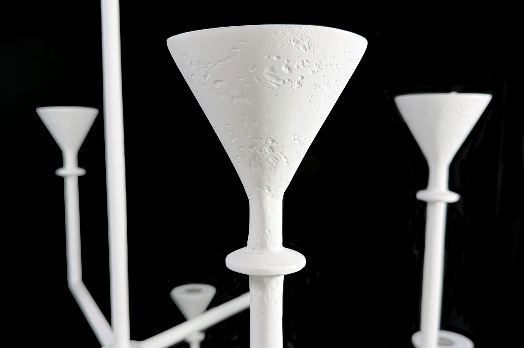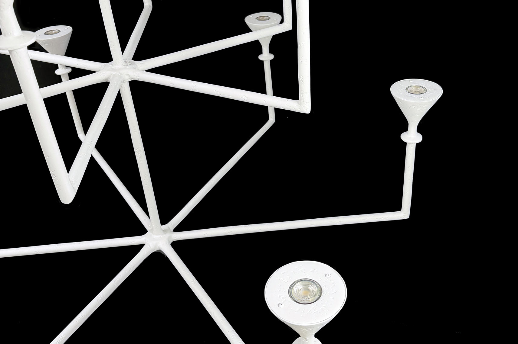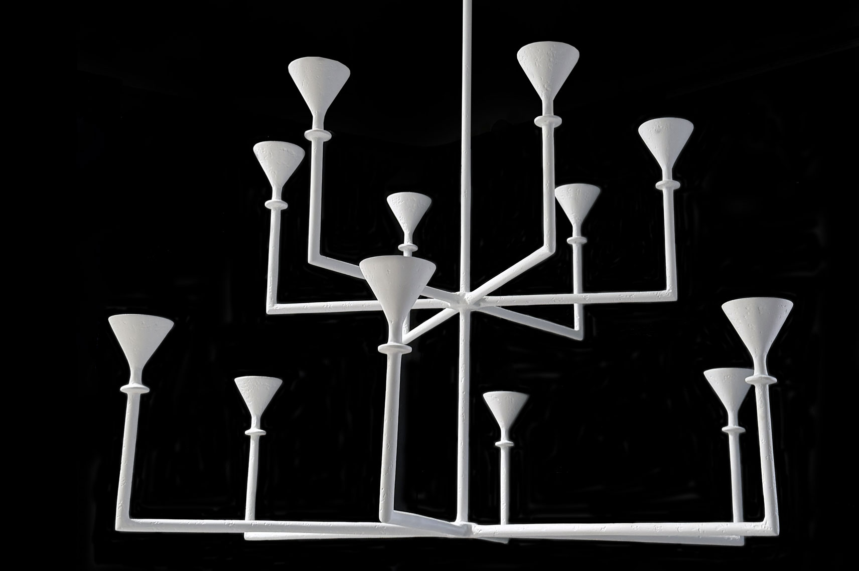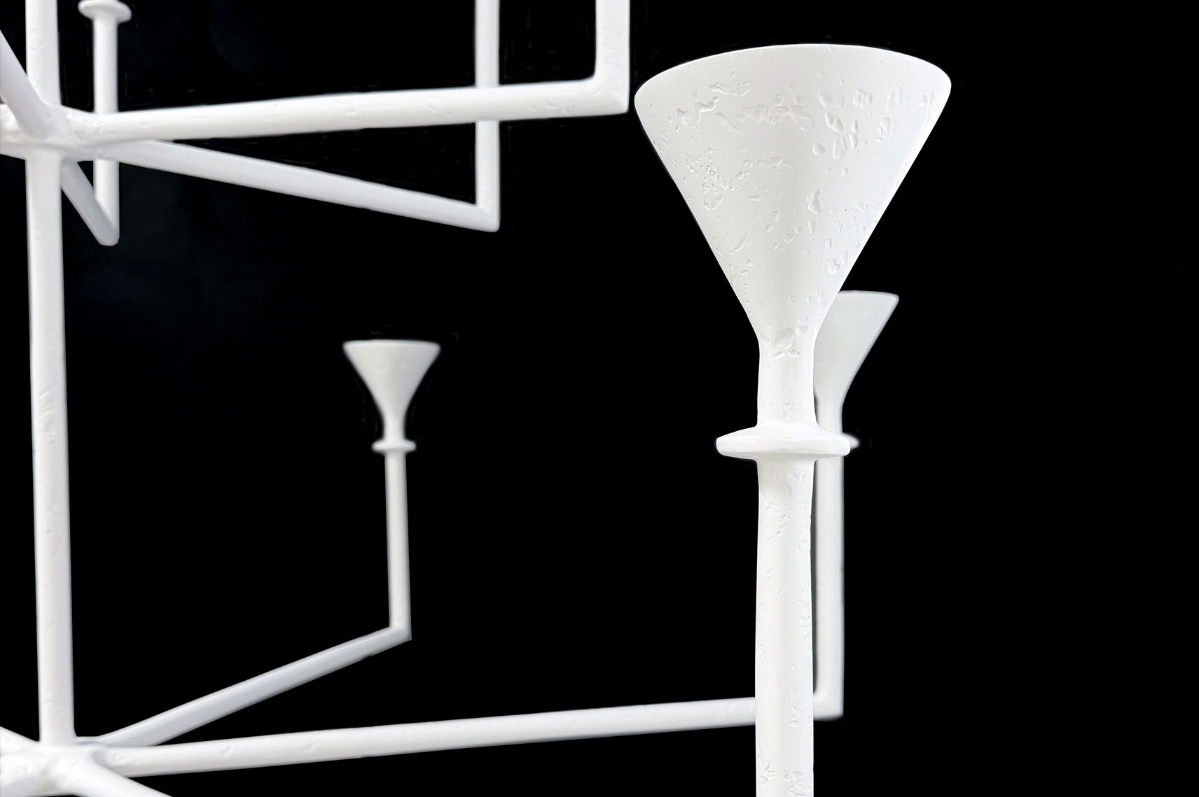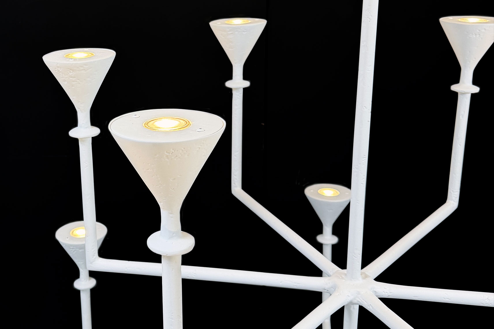 The silhouette of this Chandelier is both geometric and fluid, making it equally at home in contemporary or traditional interiors. This hand‑crafted, 12‑branch plaster fixture features our signature matte plaster finish and a sculptural, timeless presence. Its upward‑reaching arms provide abundant architectural uplighting, delivering efficient, modern illumination through twelve GU10 LED bulbs. Fully customizable in scale, finish, and configuration.